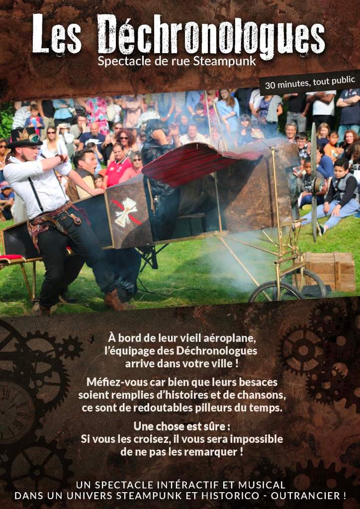 À bord de leur vieil aéroplane, l’équipage des Déchronologues arrive dans votre ville ! Méfiez-vous car bien que leurs besaces soient remplies d’histoires et de chansons, de pétards et de feux d’artifices, ce sont de redoutables pilleurs du temps.